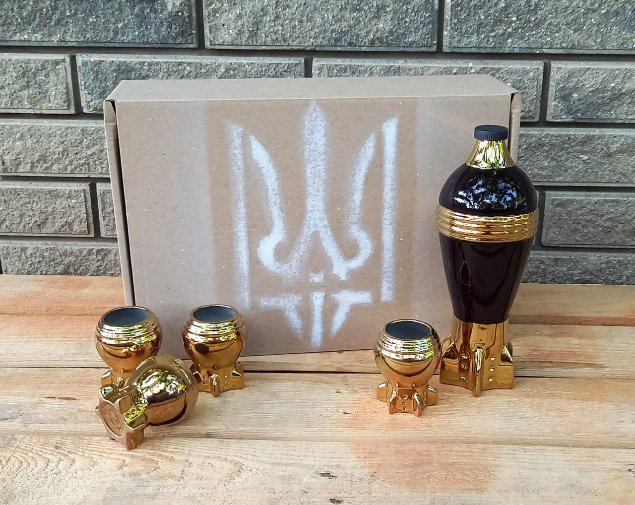 Подарунковий набір для чоловіків - бутилка у вигляді Артилерійської Міни для напоїв з чотирма рюмками які імітують снаряд. Все це знаходиться у подарунковій коробочці з патріотичним надписом Герб Україна.